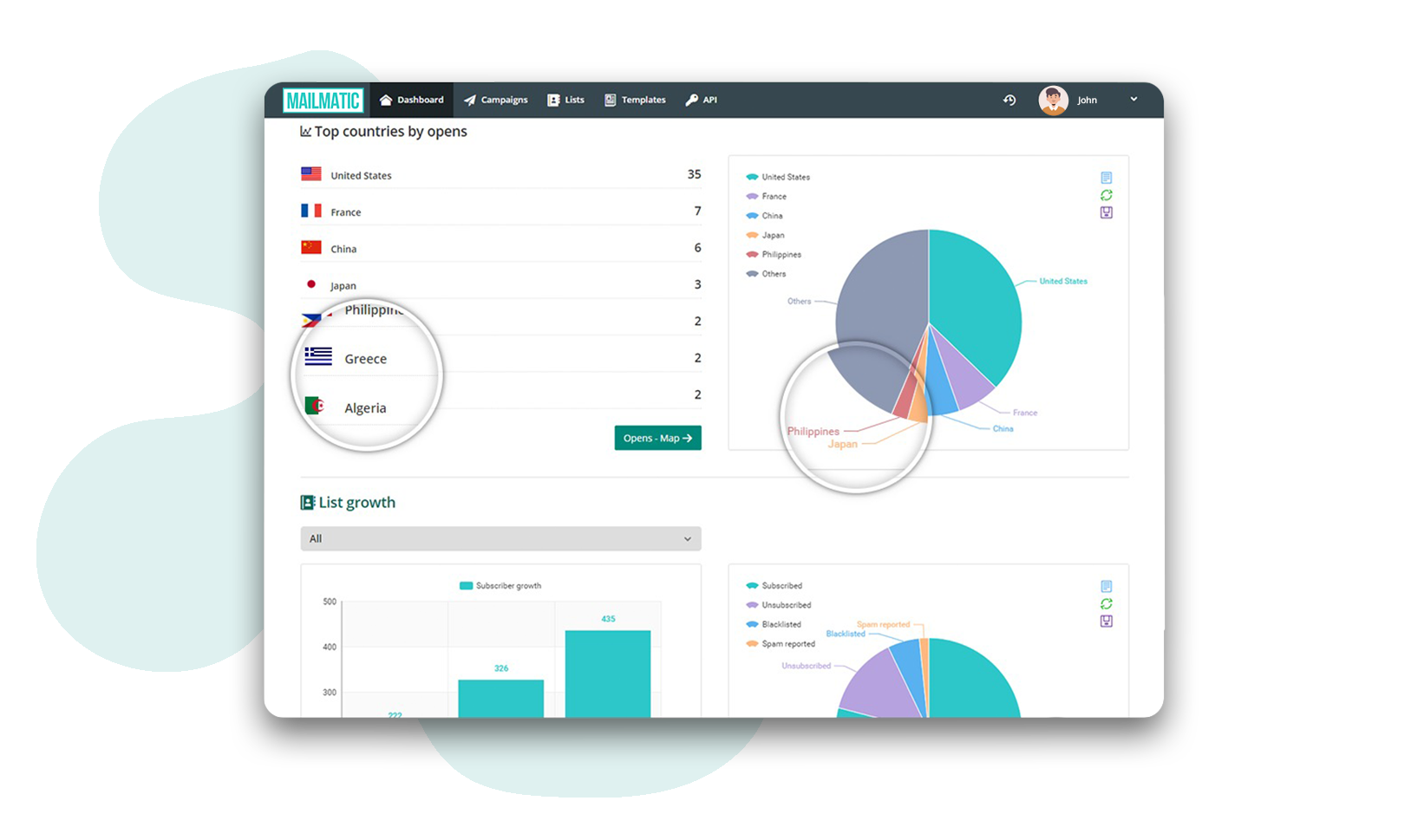 Keep track of all aspects of your campaign results: opens, bounces, complaints are all tracked and visualized with interactive charts and tables